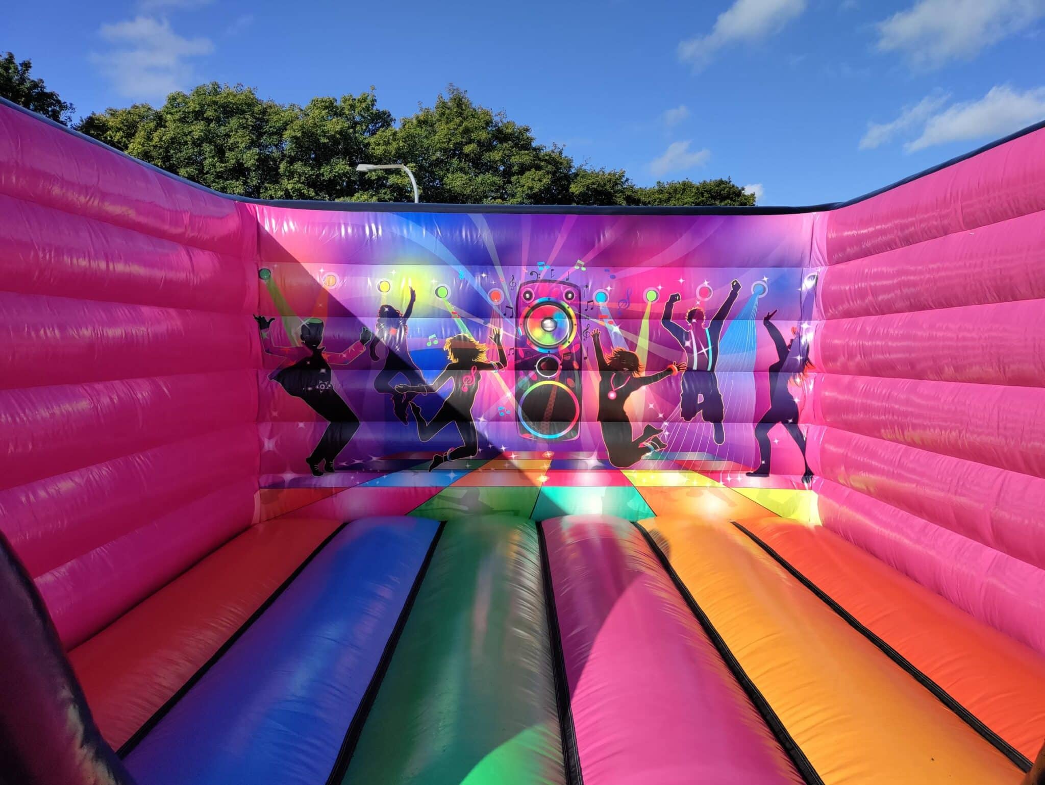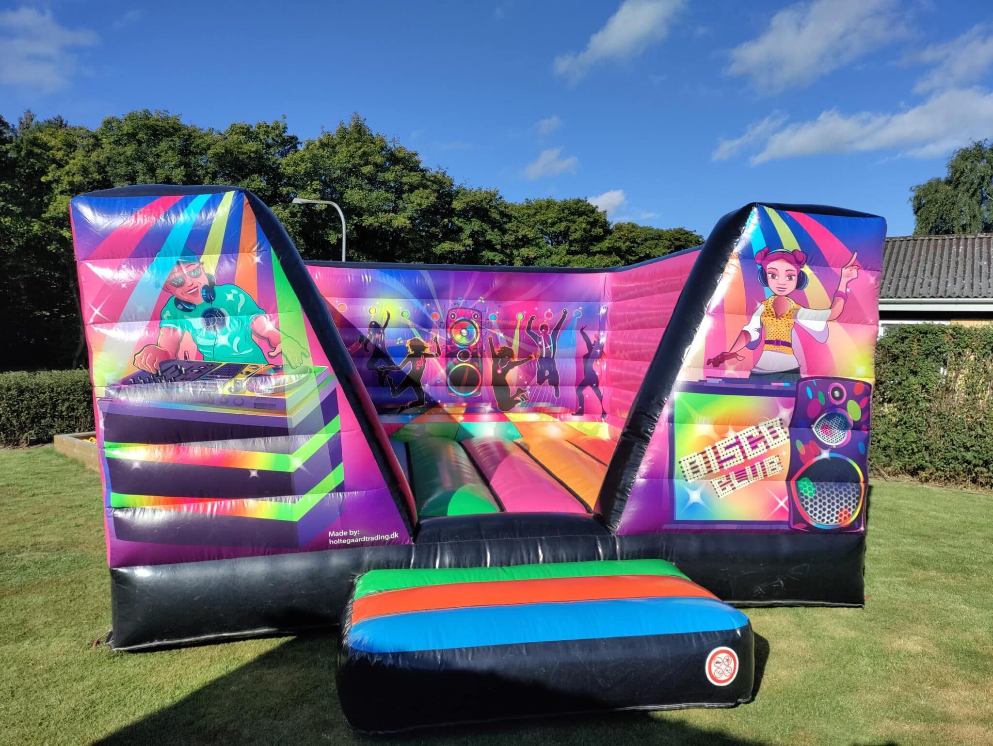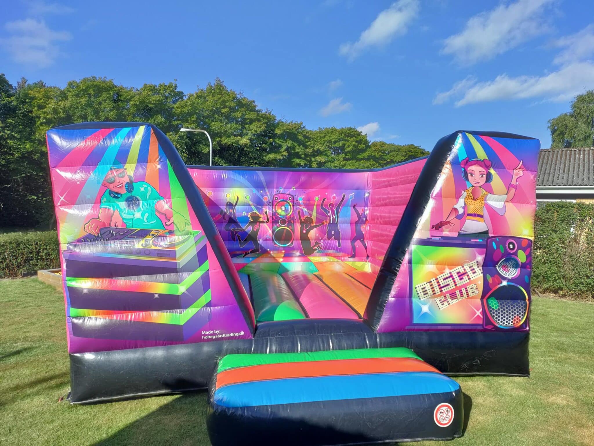 Disco V Hoppeborg er en superfed hoppeborg uden tag – perfekt til indendørs brug, selv hvor der er lavt til loftet.