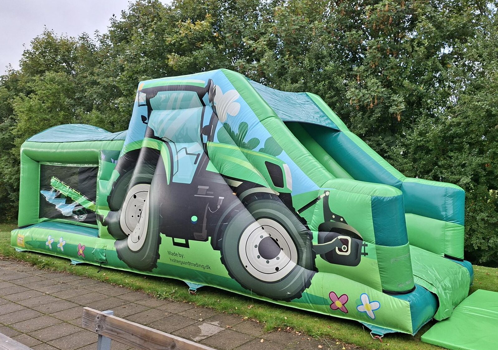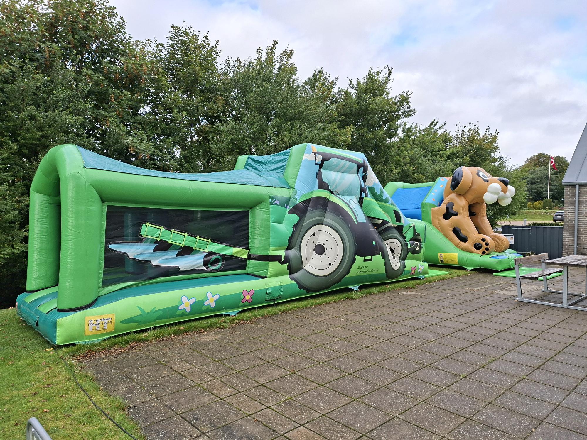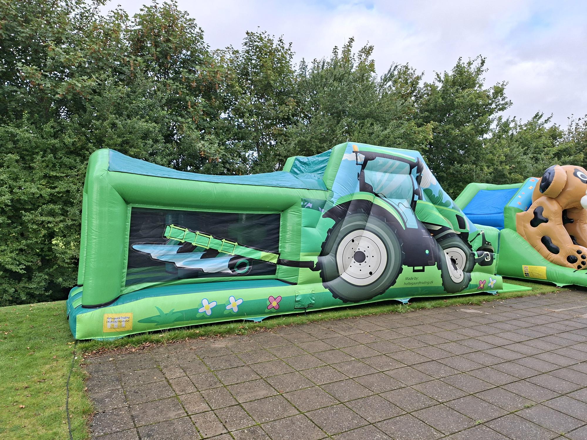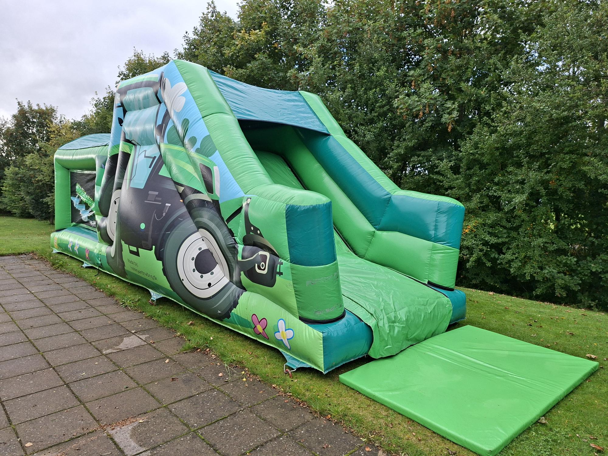 Traktor Forhindringsbanen er et hit blandt de aktive børn! Her får du en farverig og sjov hoppeborg med indbyggede forhindringer, trappe og en sej rutsjebane, der giver fart og masser af grin.